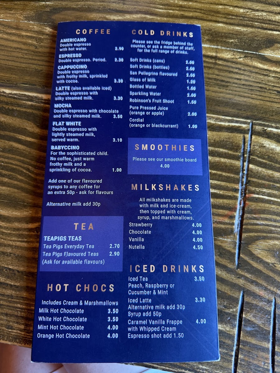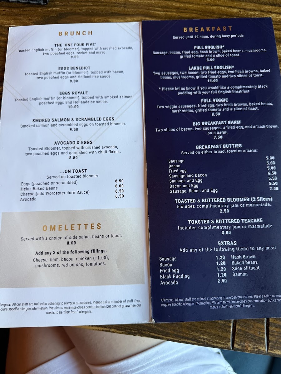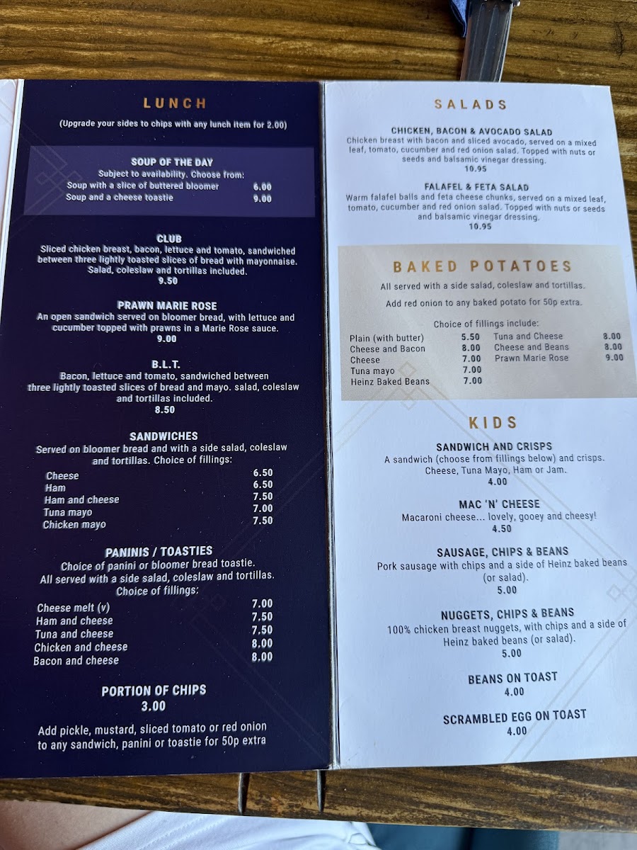 From a reviewer’s perspective, the menu at One • Four • Five offers a well-rounded selection that caters to both casual lunches and light bites. For midday meals, options like the Club, Prawn Marie Rose, and B.L.T. sandwiches provide classic favorites, while the Chicken, Bacon & Avocado Salad and Falafel & Feta Salad offer fresher, lighter choices. The sandwich and panini section features staples such as Cheese, Ham, Ham and Cheese, Tuna Mayo, and Chicken Mayo, alongside toasted options including Cheese Melt, Ham and Cheese, Tuna and Cheese, Chicken and Cheese, and Bacon and Cheese, ensuring something for every taste. For a heartier yet simple option, the Plain Baked Potato makes a versatile base for toppings. Young diners are well-catered for with items like Sandwich and Crisps, Mac ’N’ Cheese, Sausage, Chips & Beans, Nuggets, Chips & Beans, and Beans on Toast. Beverage choices are equally varied, ranging from coffees like Americano, Espresso, Cappuccino, Latte, and Mocha, to cold options including Soft Drinks, San Pellegrino Flavoured, Glass of Milk, Bottled Water, and Sparkling Water, as well as refreshing iced drinks such as Iced Tea, Iced Latte, and Caramel Vanilla Frappe. For those with a sweet tooth, the hot chocolate offerings-Milk Hot Chocolate, White Hot Chocolate, Mint Hot Chocolate, Orange Hot Chocolate-and dessert-inspired choices like Strawberry and Chocolate rounds out a menu that is approachable, diverse, and consistently comforting. Overall, One • Four • Five balances traditional favorites with lighter, modern options, making it a versatile spot for both families and solo diners alike.